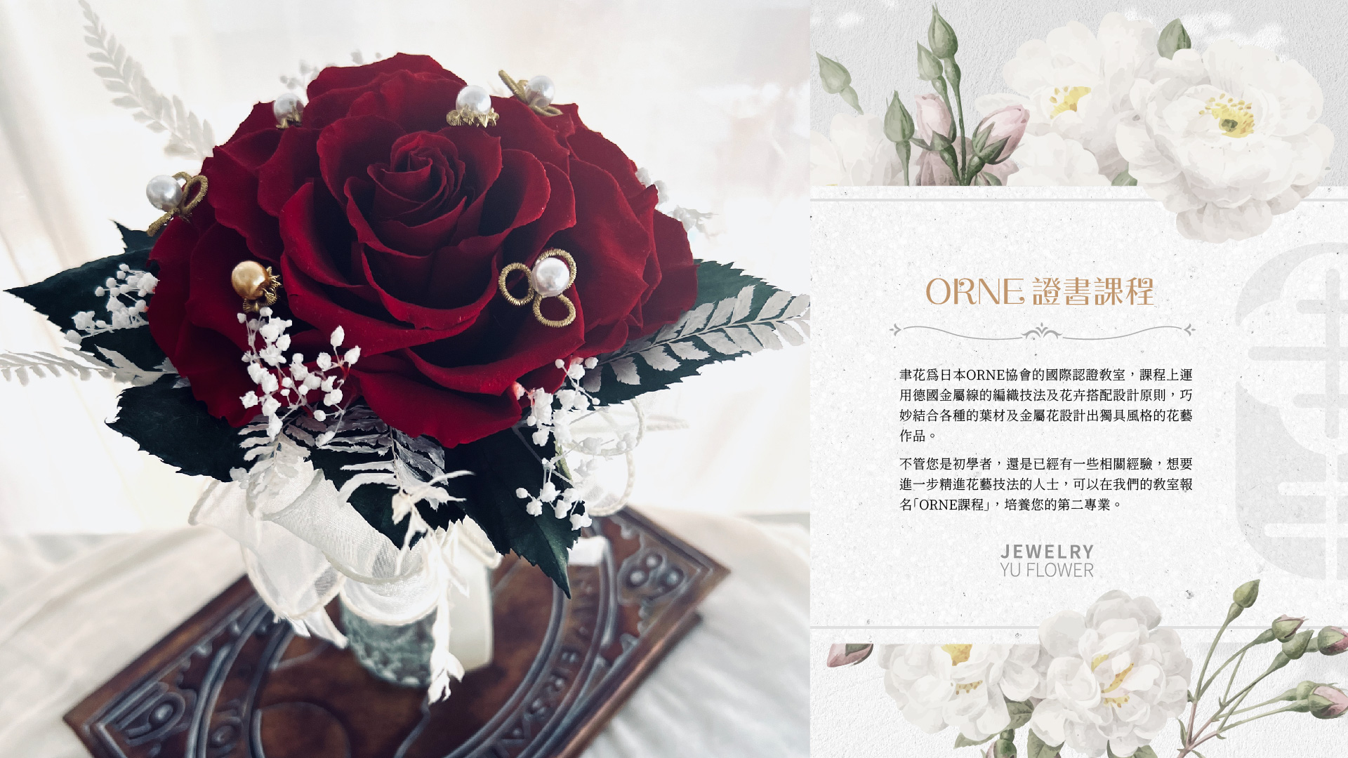 課程中您將學習如何處理不凋花材與作品呈現層次技巧掌握,並獲得專業指導和認可。